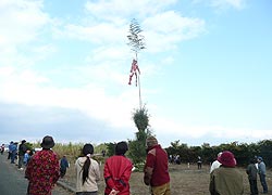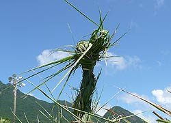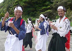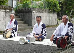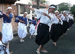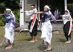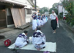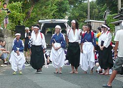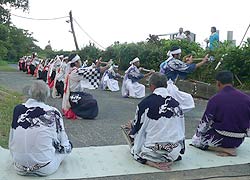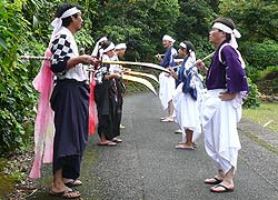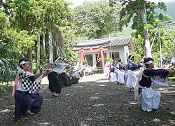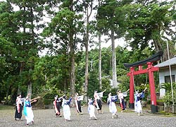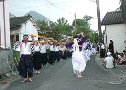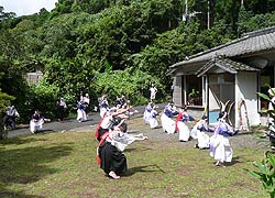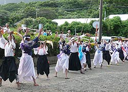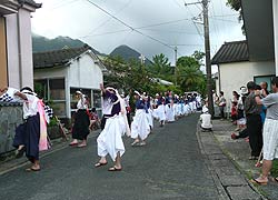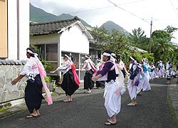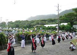 300年前から麦生集落に伝わる盆踊りです。毎年8月13日と15日に踊ります。13日夕方は、お寺まで帰ってこられた先祖代々の精霊を慰めるために踊られ、15日にはお寺の他、神社、海岸、墓地で踊りが奉納され、ほぼ一日中踊ります。最後は15日夕方の村中で踊り、精霊の皆様をお送りします。
