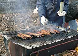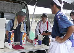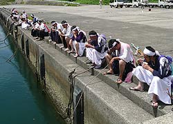 【海岸】岸壁に並んで氷をほおばる踊り手たち