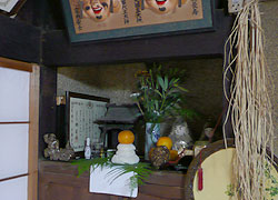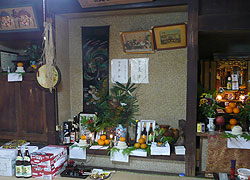 左から、船の神様、床の間の神棚、ご先祖様の仏壇