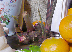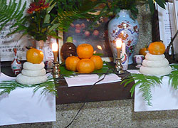 供え物の里芋は小芋がたくさんつくことから、子孫繁栄の象徴として、ダイダイは「家が代々続く」との願いをこめて供えます