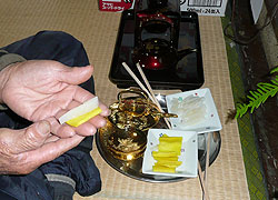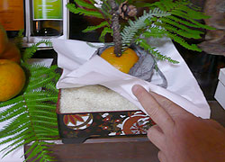 左写真のつづき。半紙の下の重箱に一升の米を入れます。この米は20日に食べます