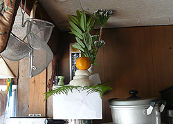 台所の荒神様にも、鏡餅とユズリハ、雪松を飾ります