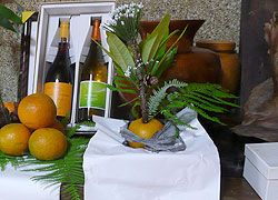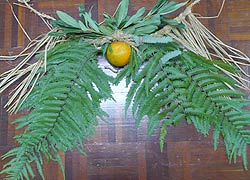 供え物。半紙の上にダイダイをのせ、雪松、ユズリハ(いずろは)、ウラジロ(もーむき)を刺して立て、昆布を巻いたもの。