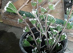 雪松。昔はマツの葉に脱脂綿を乗せ、雪に見立てたそうです。今は白い粉を糊でつけます